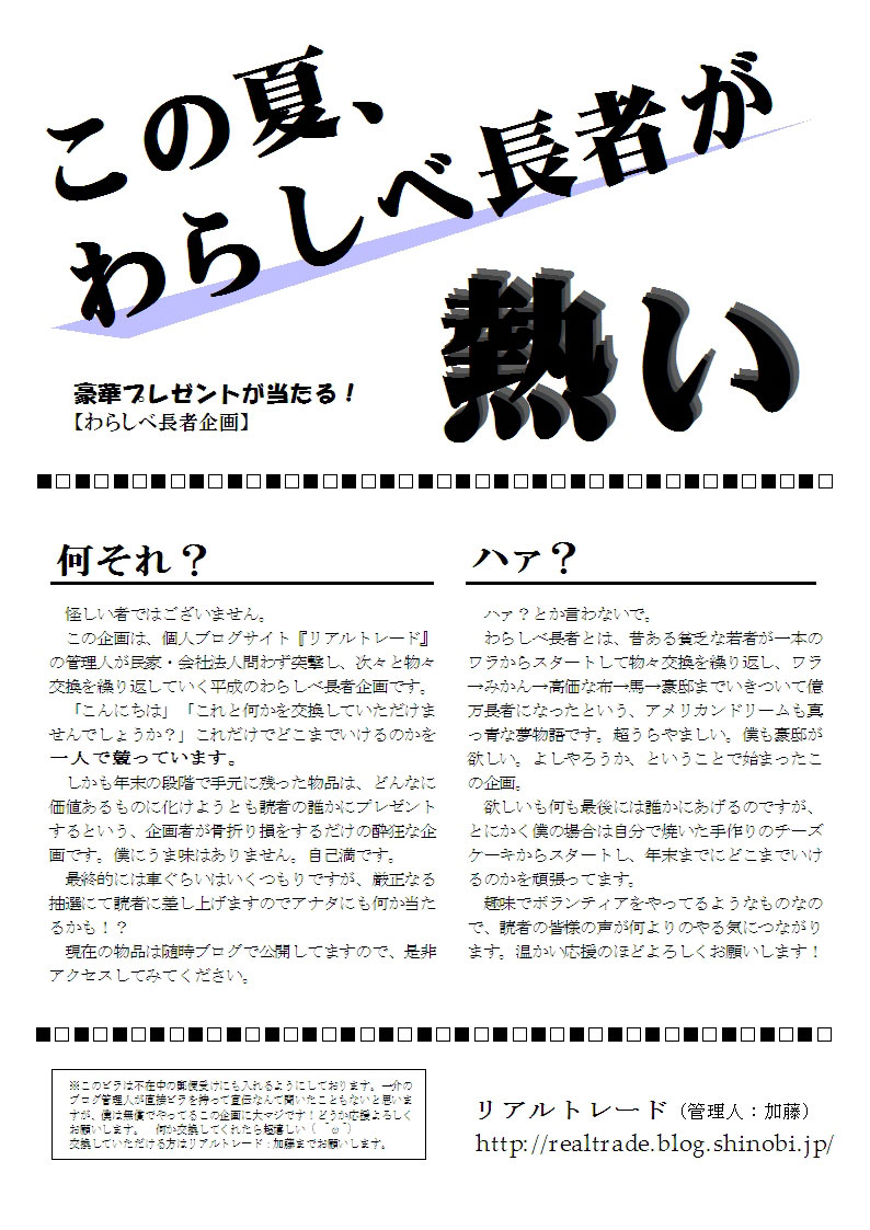 まるで「今年の夏の流行はわらしべ長者で決まり」みたいな錯覚を覚えるこのコピー。わらしべ長者なんて絶対に流行りません。どう見ても錯覚です。